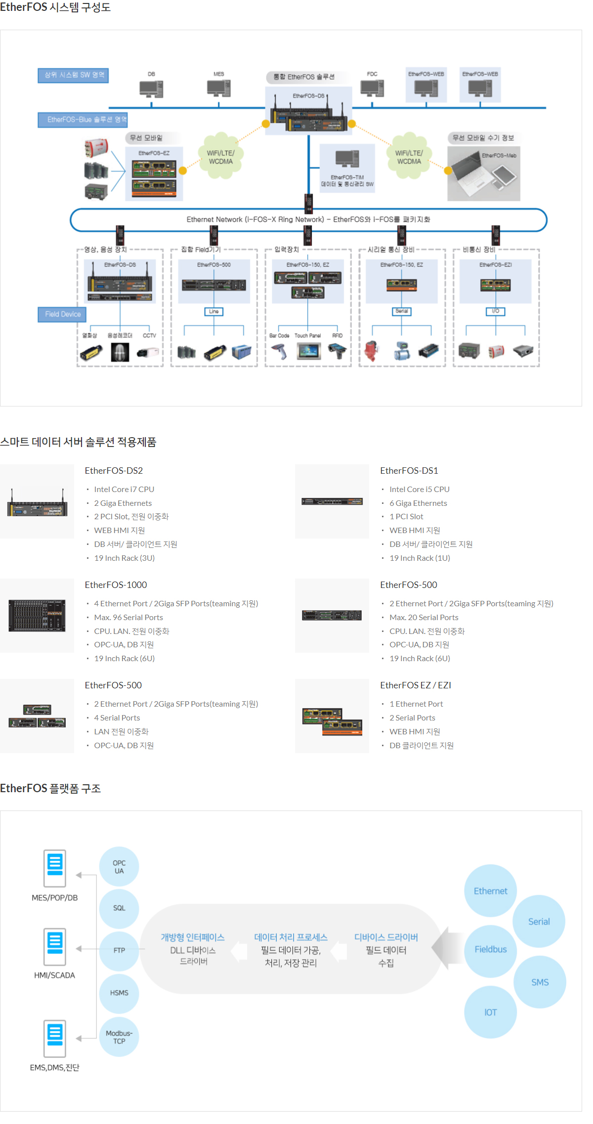 – EtheFos의 강력한 통신 기능을 통해 기존 장비가 핵심 네트워크에 연결되는 것이 가능하고, RS232C, RS422 / RS485, Ethernet, DIO, AIO와 같은